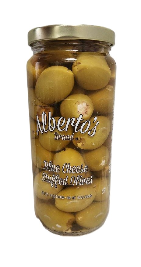 Large green olives hand stuffed with blue cheese. The briny bite of the olive combined with the rich, creamy cheese is a beautiful combination.