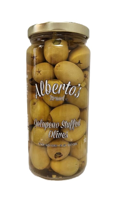 A premium green olive stuffed with a sliver of a pickled jalapeno pepper. They offer a bold, briny, and savory flavor profile with a medium heat kick. balancing the crisp texture of the olive with a crunchy, spicy burst from the jalapeno.
